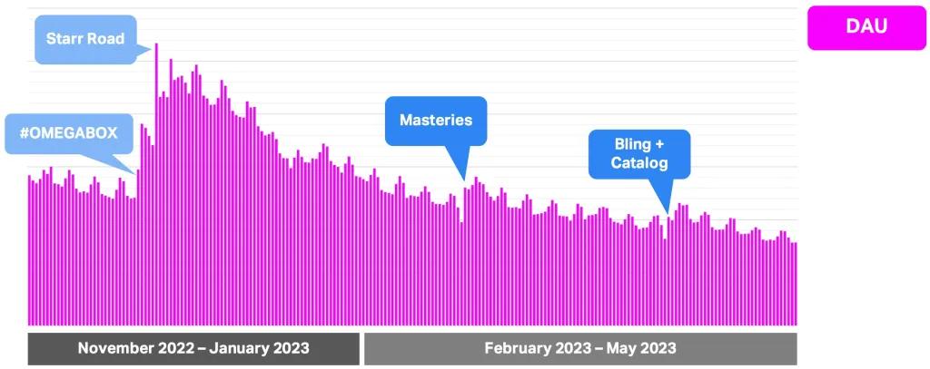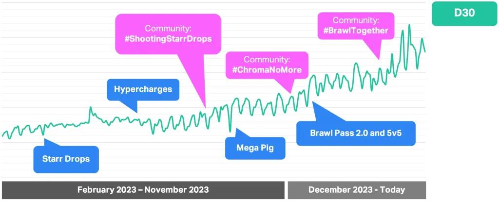 但后来的数据证明,这种改动并不受玩家待见。22年年底《荒野乱斗》用Starr Road取代开箱子后,游戏数据只回暖了一会儿,然后活跃继续下滑。
