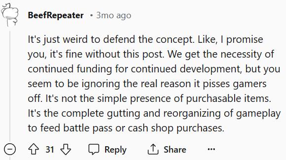 ……作为玩家,其实我们完全理解厂商往游戏里砸了更多成本、需要赚更多钱。只是厂商似乎还不明白自己是怎么把玩家惹怒的:我们并不是因为有内购就生气,而是因为有人把完整的游戏体验拆毁、重组,只为了逼玩家去买战令、参与内购。