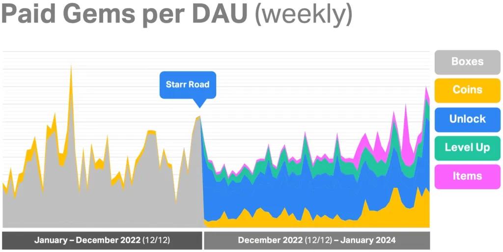 于是,他们把随机奖励以Starr Drops的形式加回了游戏——玩家每天赢8场,就能开3个宝箱;后来的更新,又进一步允许玩家通过社交、排位赛、活动等其他途径,获取Starr Drops奖励。从这儿开始,游戏的30日留存逐步回升。这事让他们想清楚了:“我们的玩家,是喜欢随机奖励带来的刺激、兴奋感的。”