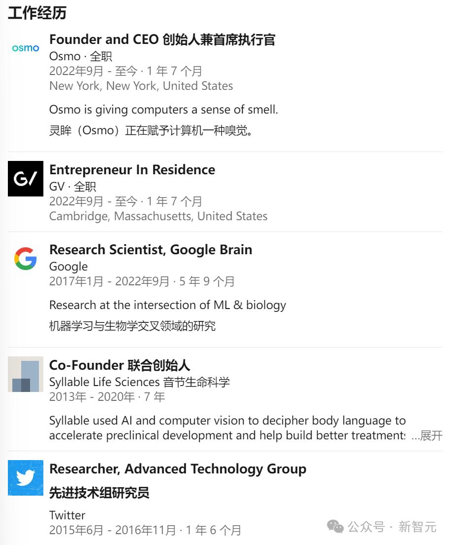 2022年,他创立了Osmo,同时,作为GV的常驻企业家,他还加入了生命科学团队,专注于推进数字嗅觉领域。