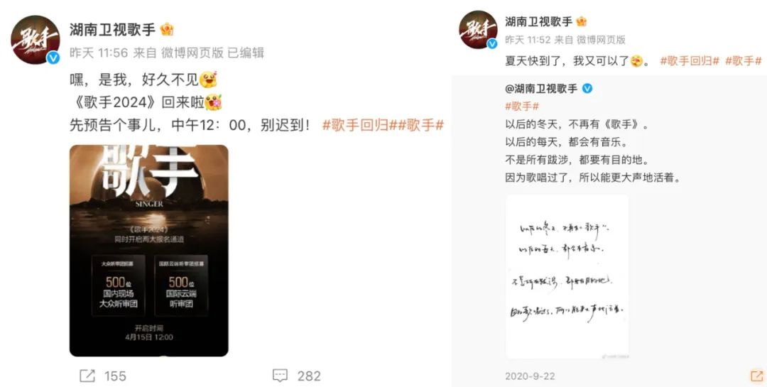“嘿,是我,好久不见,《歌手2024》回来啦”,4月15日,名为「湖南卫视歌手」的官博突然“复活”,正式官宣了《歌手》回归、并发布了「500位国内现场大众听审团」+「500位国际云端听审团」的官方招募令。