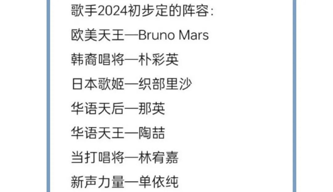 在目前网传阵容里,霉霉(Taylor Swift)、火星哥(Bruno Mars)等欧美流行天王天后的名字赫然在列,但鉴于他们出场费过分高昂,名单里朴彩英(韩团BLACKPINK成员)、织部里沙(《鬼灭之刃》主题曲演唱者)这类咖位的海外歌手似乎更有来华可能。