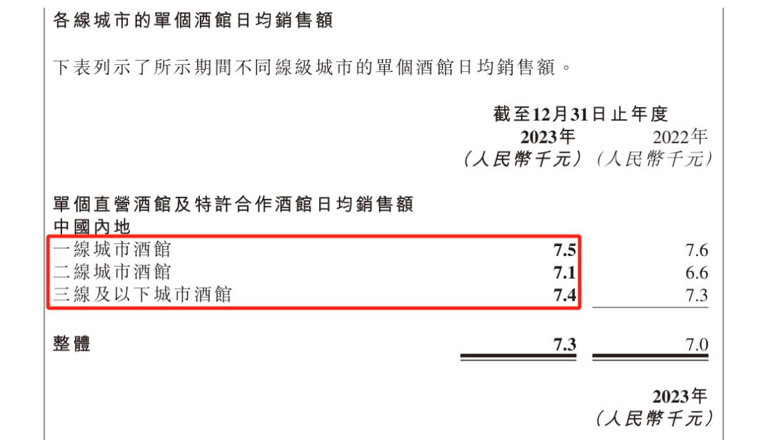 不仅如此,其酒馆在一线、二线和三线及以下城市的销售额也没有拉开显著差距。财报显示,2023年,海伦司单个直营及特许合作酒馆在一、二和三线及以下城市的日均销售额分别为:7.5、7.1和7.4千元。