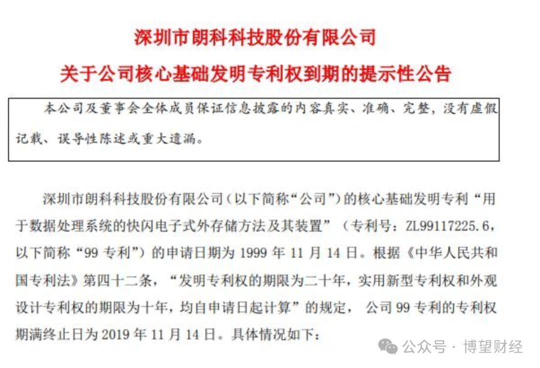 2019年11月14日,朗科科技在公告中表示:“公司的专利运营业务对99专利形成重大依赖,该专利的到期将对公司今后的营业利润产生一定不利影响。公司目前尚无有效措施从根本上解决该专利到期后对公司经营造成的风险。”