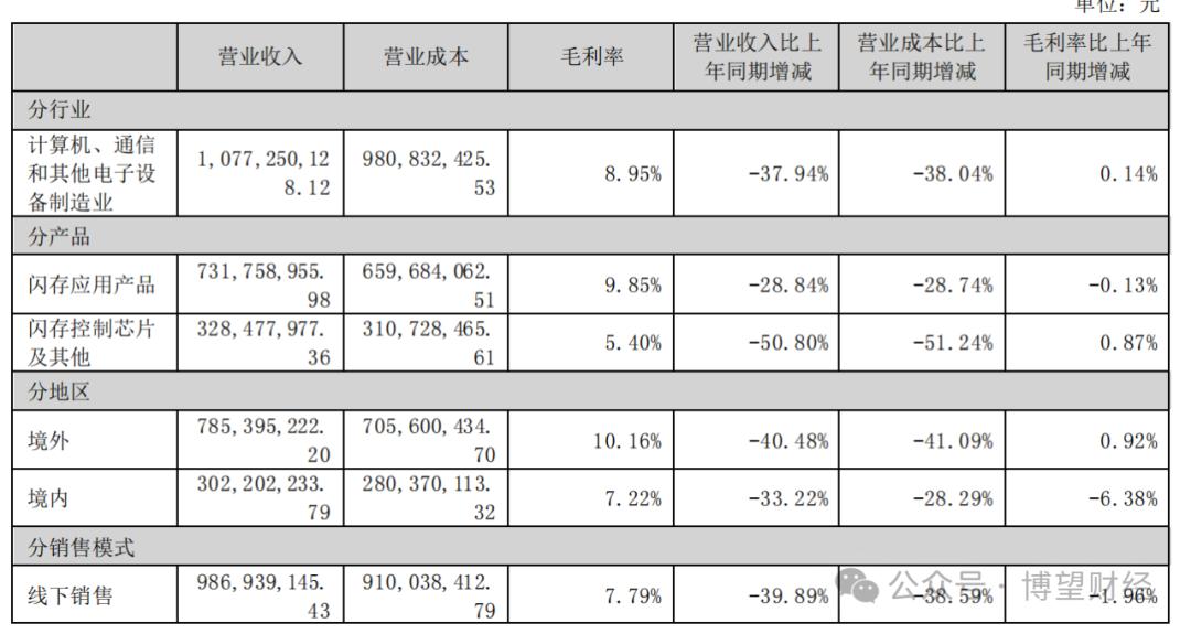 朗科科技2023年年报显示,其闪存应用产品的毛利率为9.85%;“闪存控制芯片及其他”的毛利率则仅为5.40%。