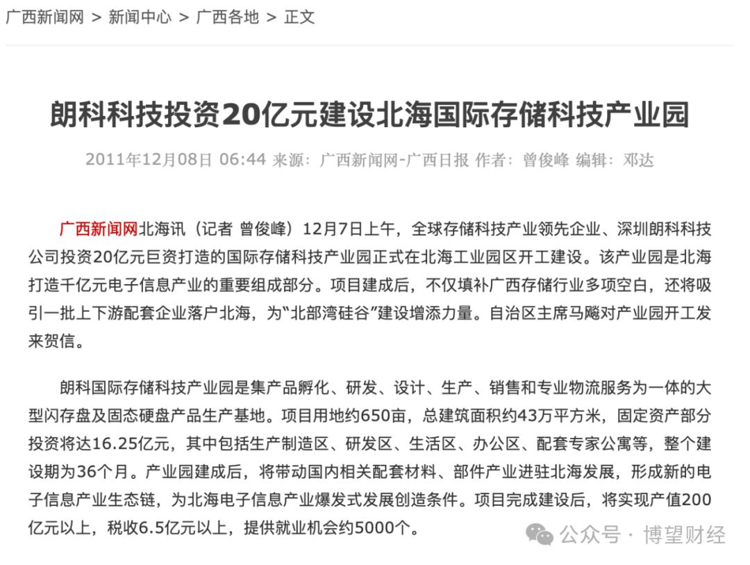 值得注意的是,当年广西项目,并非没有当地政府背书和扶持。相反,广西自治区政府承诺,2011年给予朗科科技的产业扶持资金为3500万元,2011年至2015年五年累计给予扶持资金为3亿元人民币。
