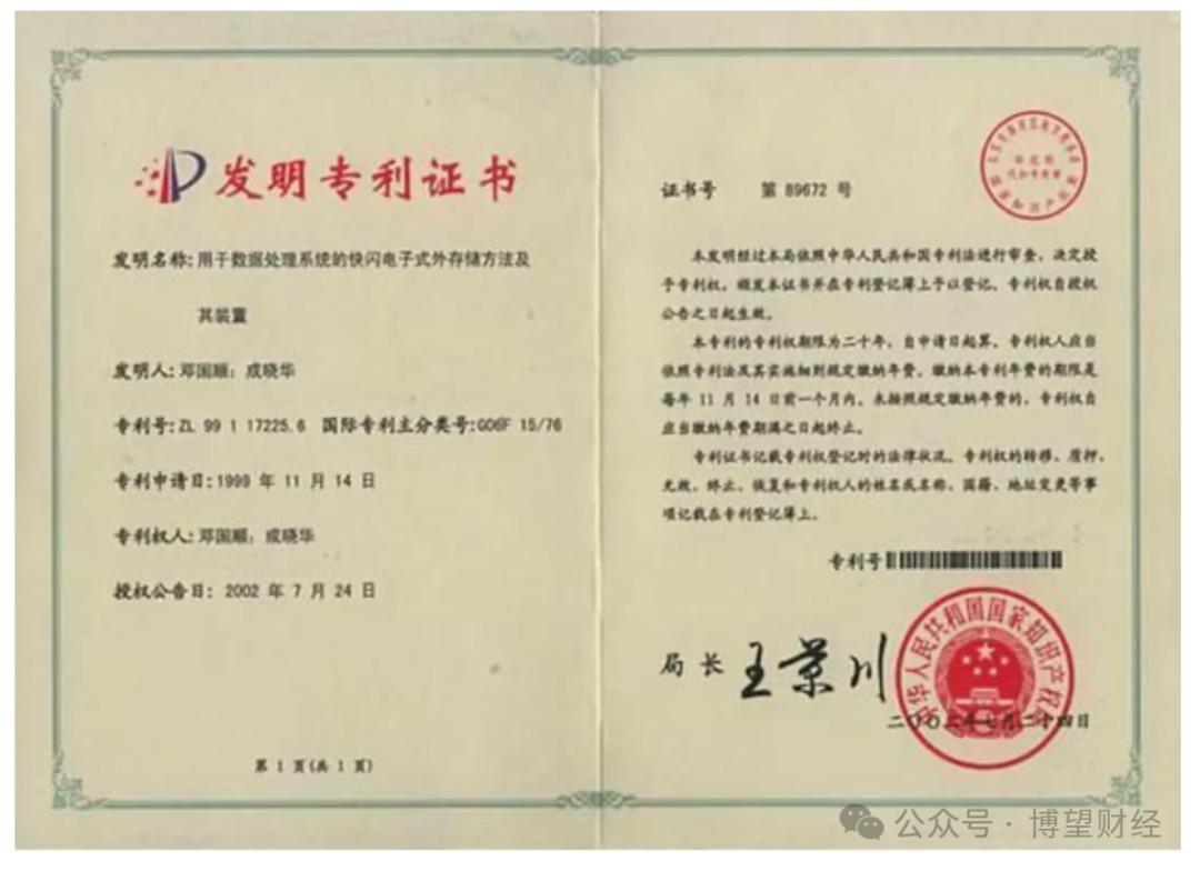 凭借优盘这一发明创造,朗科于1999年获得第ZL99117225.6号中国发明专利等一系列原创性基础发明专利。