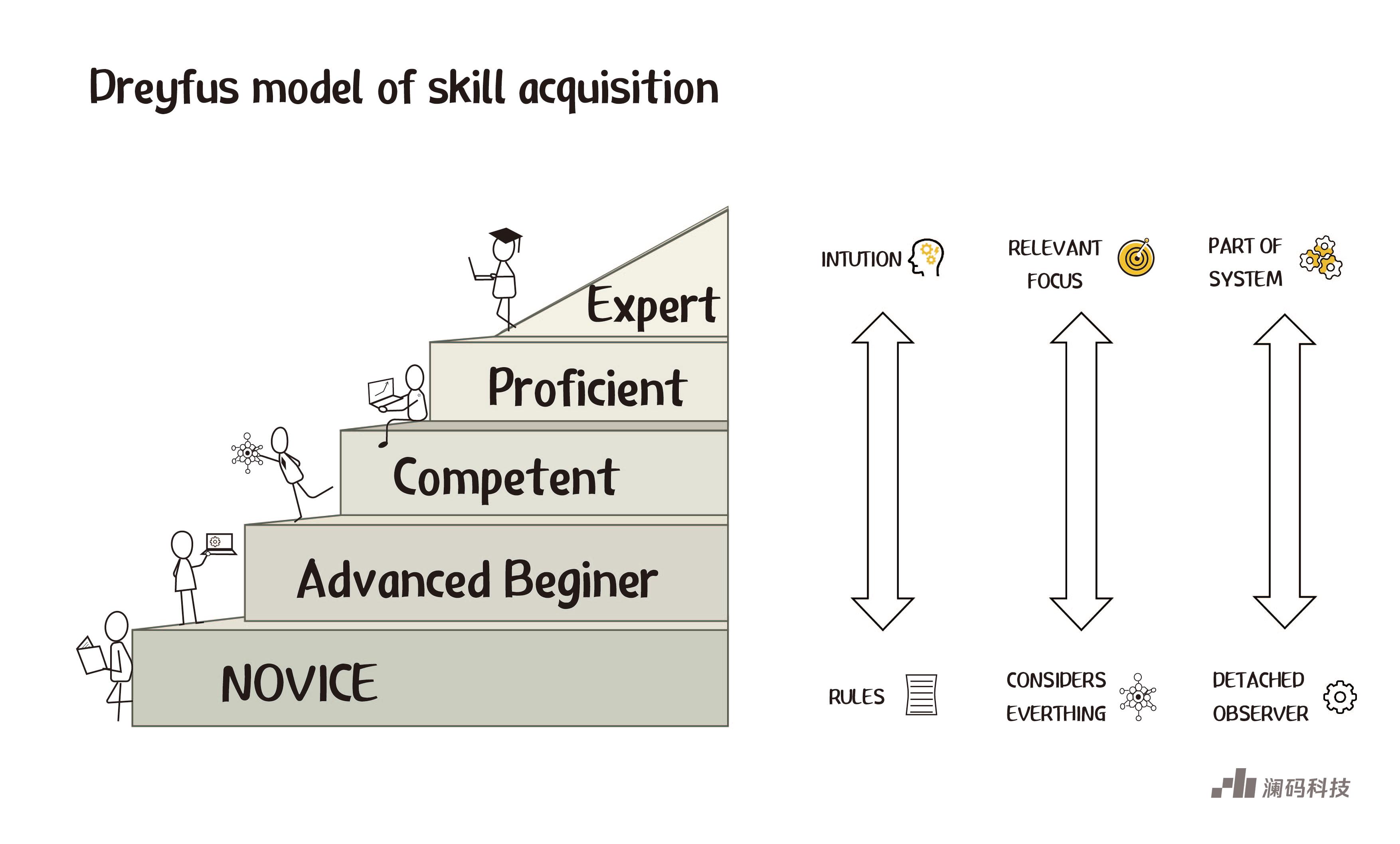 1980年,加州大学伯克利分校的Hubert和Stuart Dreyfus兄弟提出了一个名为“德雷福斯模型”(Dreyfus model)的学习进展框架,将一个技能的学习程度类比成阶梯式的模型,即一个人通过外部指导学习一项新技能时,会经历五个发展阶段:新手、高级新手、胜任者、精通者和专家。