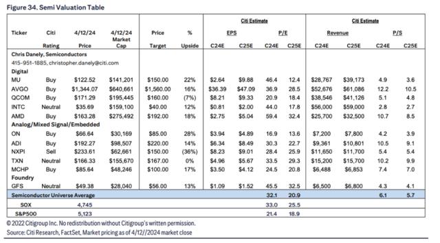花旗强调,尽管当前半导体股估值处于高位,且一季度业绩较为平淡,但在AI需求的推动下,仍有上行空间,现阶段不宜单纯基于估值而抛售半导体股票,继续看好半导体股的前景。
