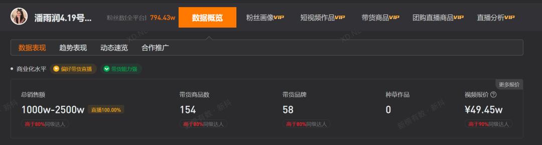 如果按新抖数据显示的,潘雨润最近一年的带货额6.2亿元来看,她起码可以在这份百强榜单上位列第50位。但这这说明,起码有50个粉丝比她多得多的带货主播销量不如她。