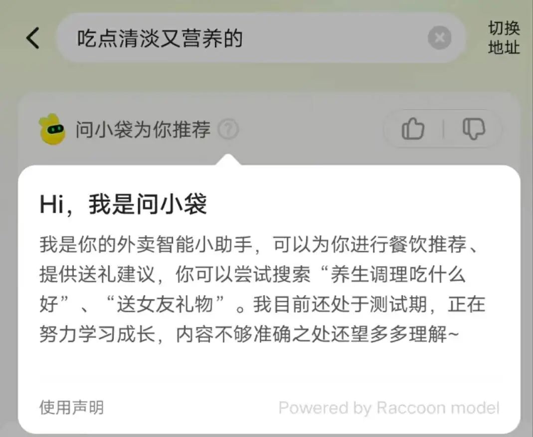 “问小袋”是基于Raccoon model(浣熊大模型)的一款外卖智能助手产品,可以为用户进行餐饮推荐、提供送礼建议等服务,类似于导购助手。