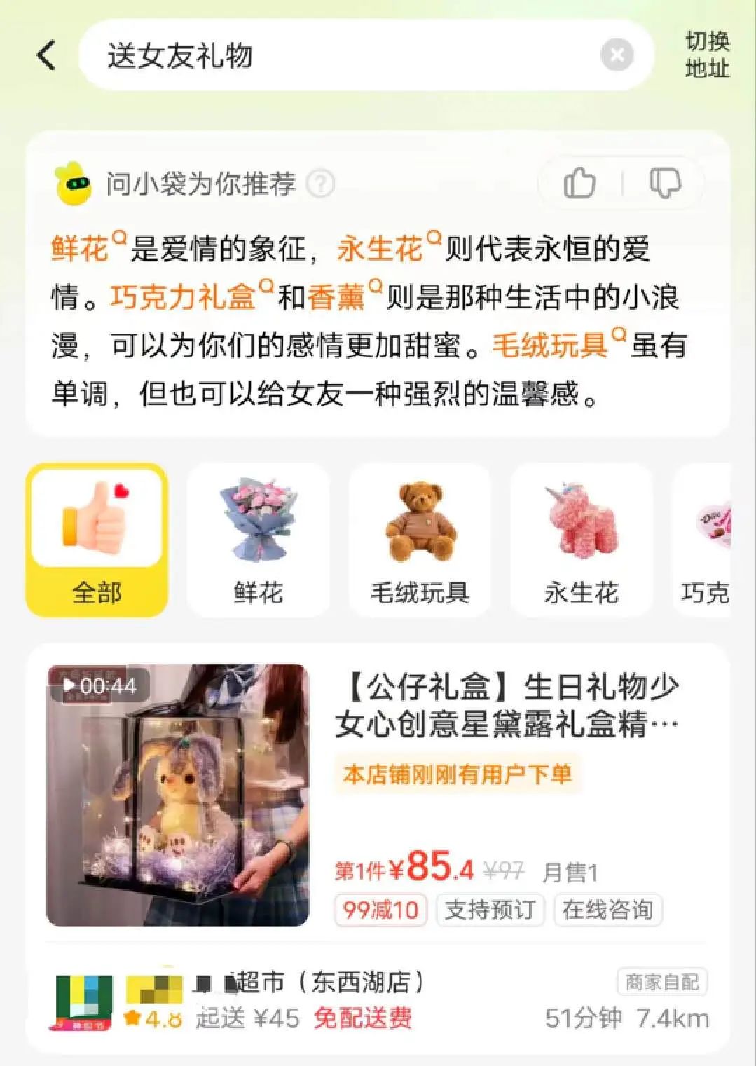 Tech星球体验发现,“问小袋”可以根据用户搜索的关键词或关键语句,自动匹配符合用户消费意图的外卖商品。例如,搜索“送女友礼物”,“问小袋”会推荐鲜花、巧克力盒、香薰等外卖商品,并且将这些商品进行分类,让用户按照需求进行筛选购物。