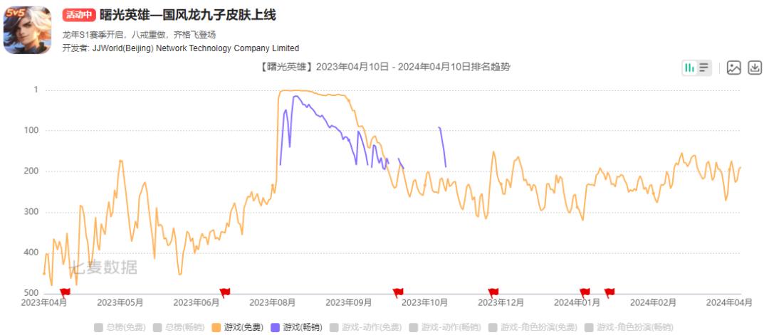 《曙光英雄》一度遇到了泼天富贵,却没能够完全接下这突如其来的流量。从iOS畅销榜细分排名来看,《曙光英雄》的收入水平仍在逐渐下滑,几近回到去年翻红之前的水平。