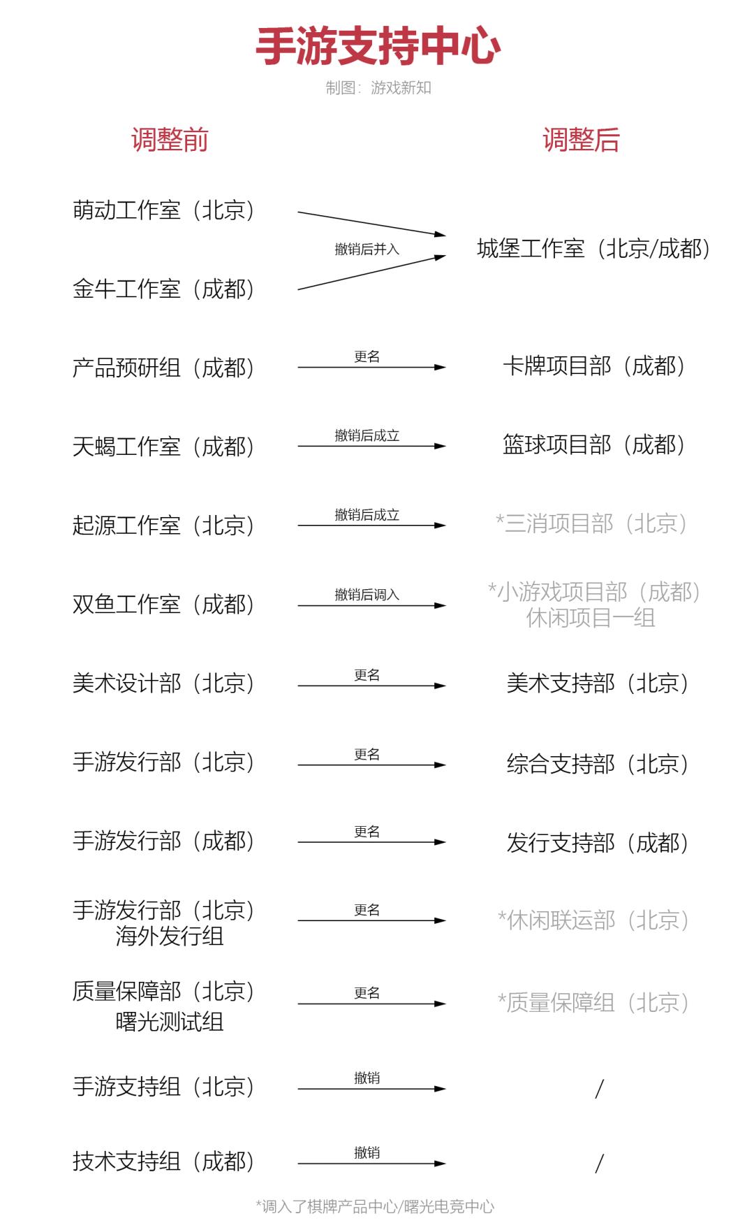 其中原有的手游工作室群更名为手游支持中心,大的框架维持原样。原先集团由CEO分管产品研发中心、VP分管平台支撑中心。经调整后,两大业务中心均交由COO分管,其他分管关系不变。