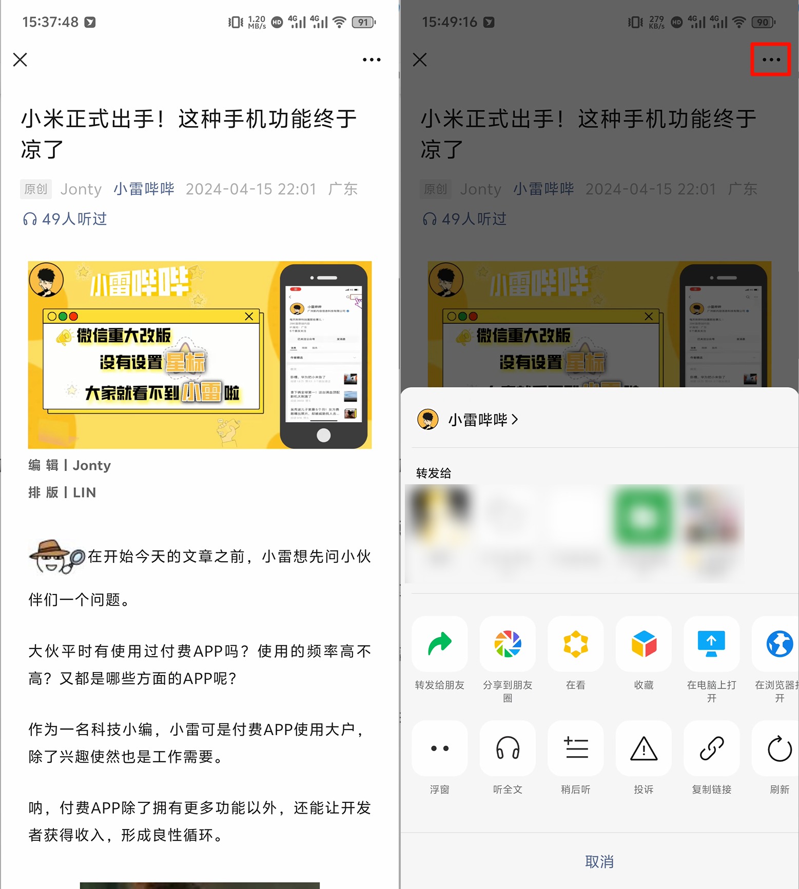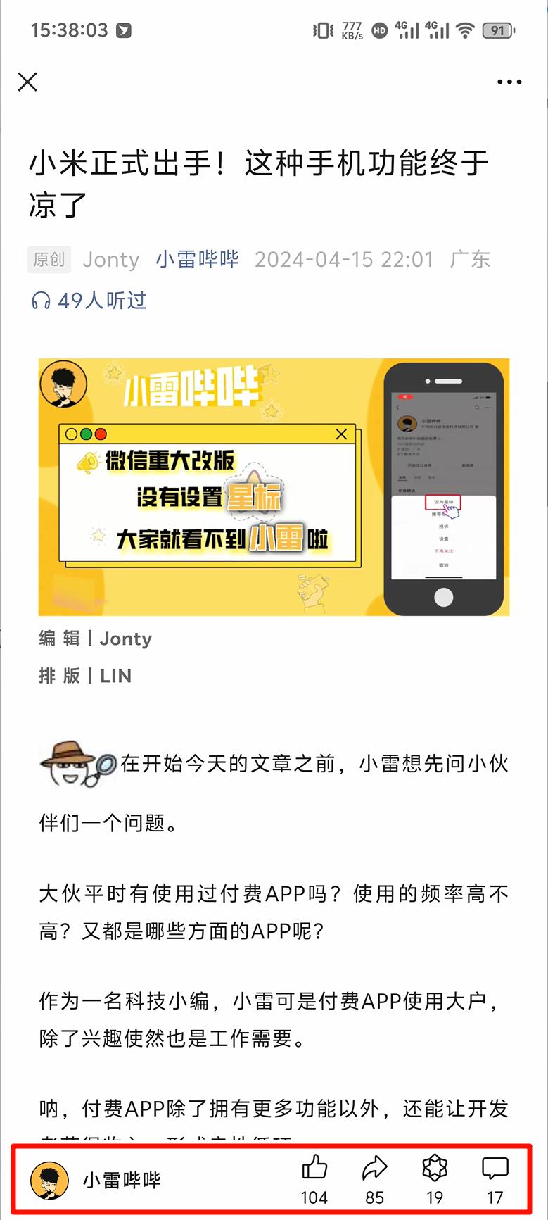 小雷首先注意到的是,我经常打交道的公众号文章界面,设计上有了一些改动。