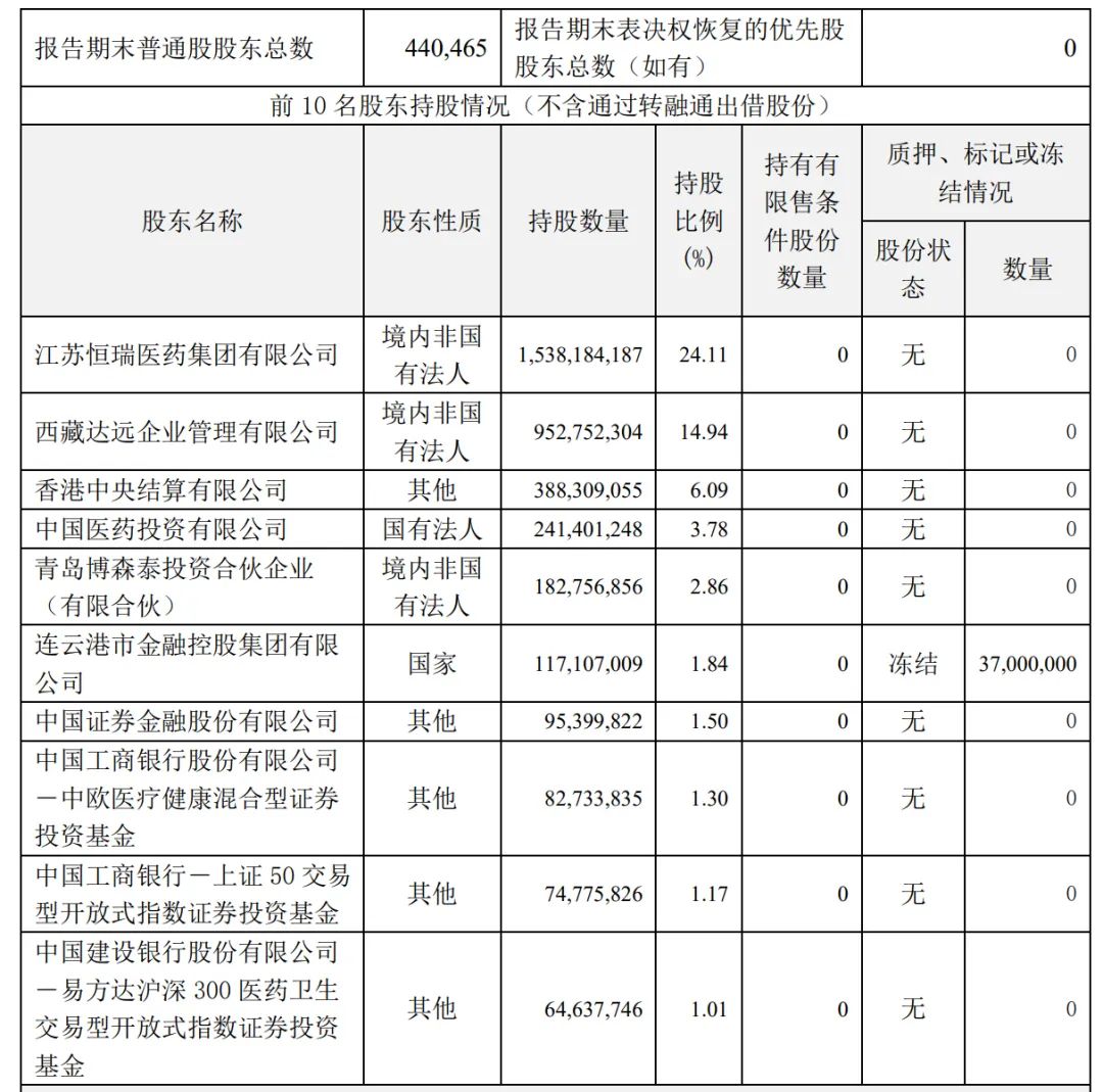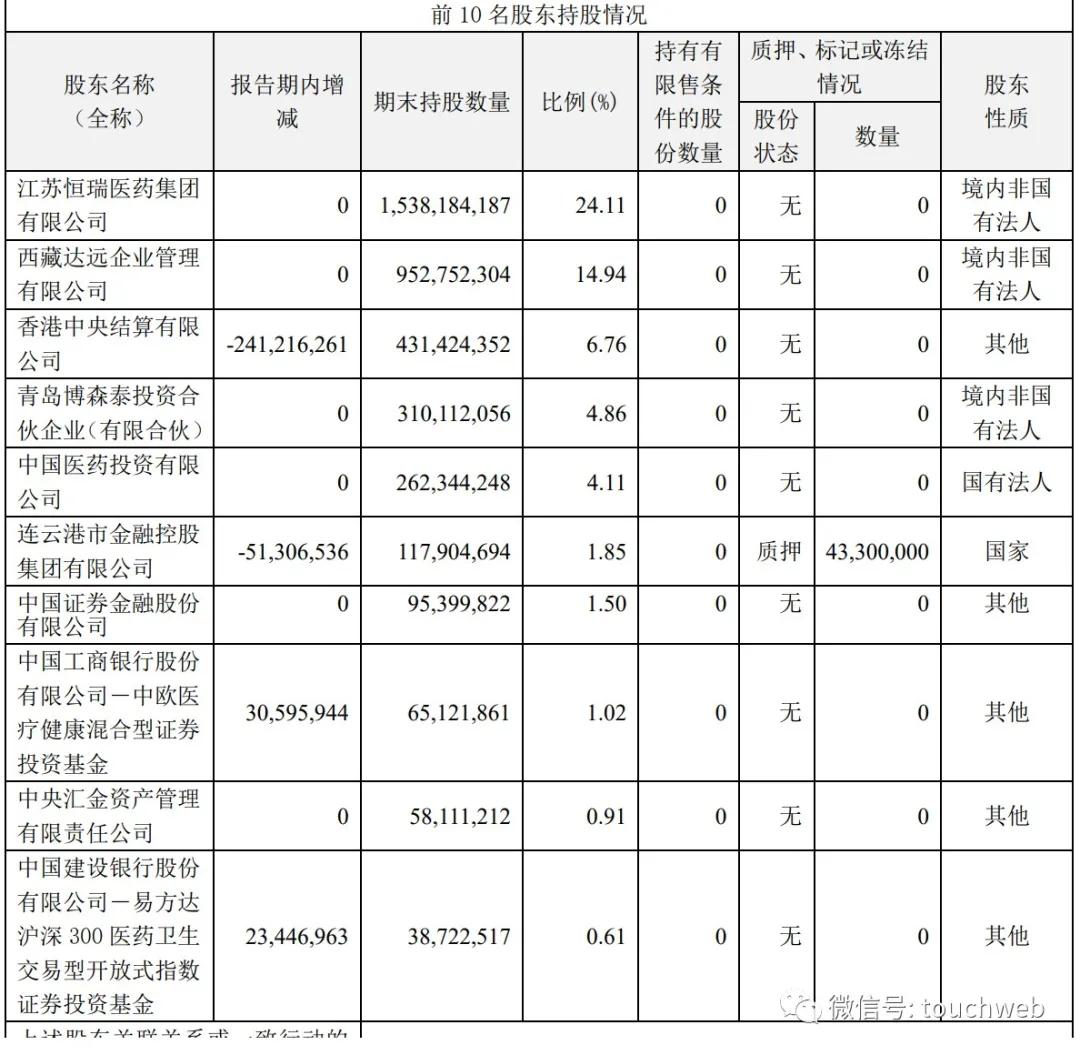 截至2024年3月31日,江苏恒瑞医药集团有限公司持股为24.11%,西藏达远企业管理有限公司持股14.94%,香港中央结算有限公司持股6.09%;
