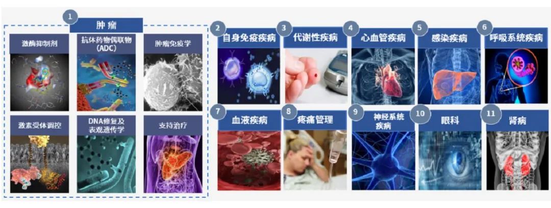 与此同时,公司在自身免疫疾病、代谢性疾病、心血管疾病、感染疾病、呼吸系统疾病、血液疾病、疼痛管理、神经系统疾病、眼科、肾病等领域也进行了广泛布局,打造长期发展的多元化战略支柱。