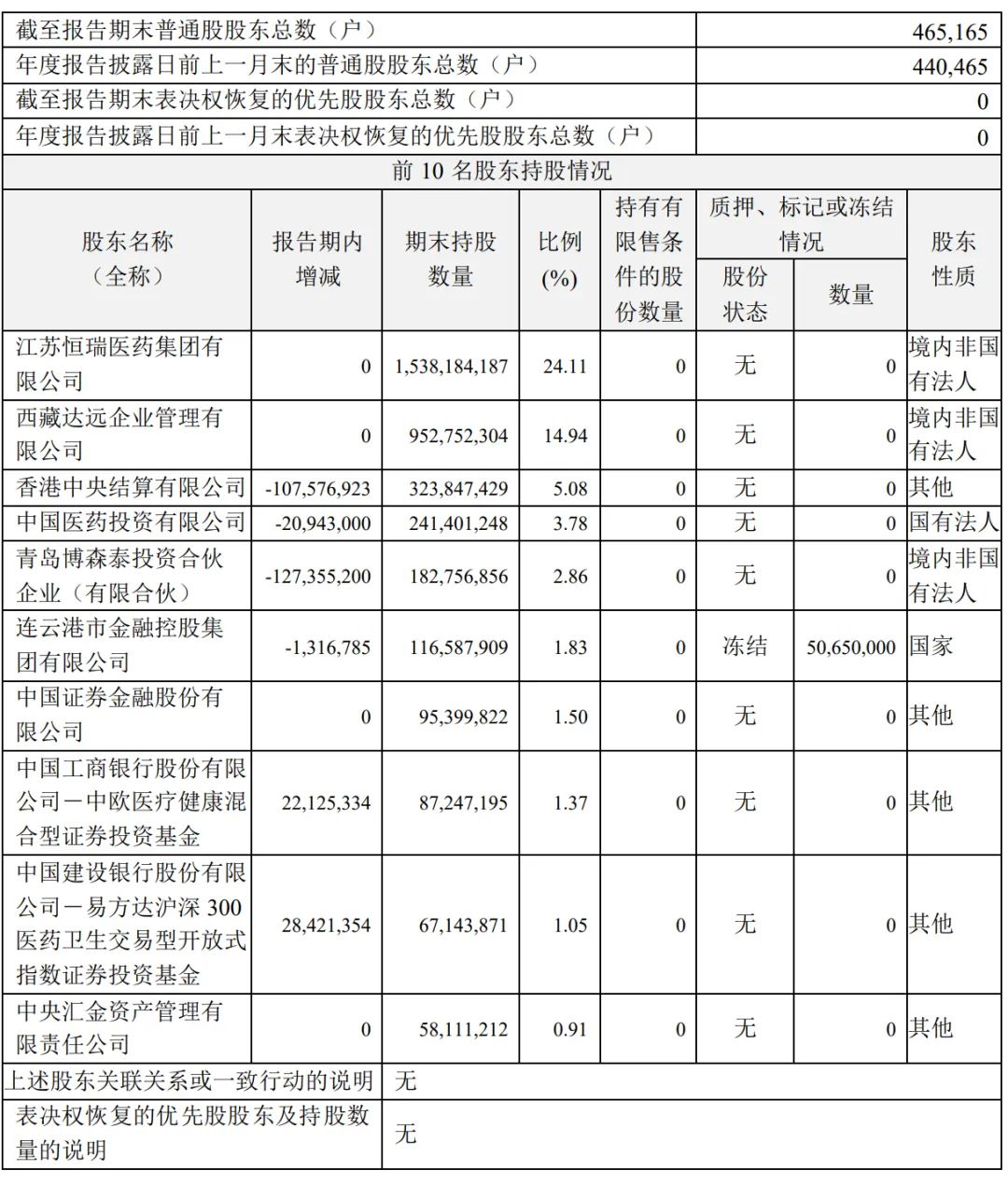 截至2023年12月31日,江苏恒瑞医药集团有限公司持股为24.11%,西藏达远企业管理有限公司持股14.94%,香港中央结算有限公司持股5.08%;