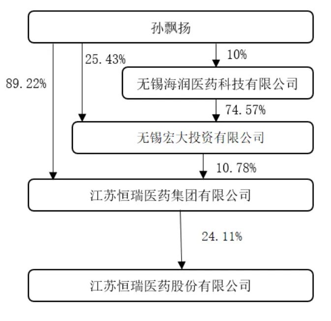 恒瑞医药实控人孙飘扬为江苏恒瑞医药集团有限公司大股东,直接持有江苏恒瑞医药集团89.2%股权,又通过无锡宏大投资有限公司控制10.78%股权。