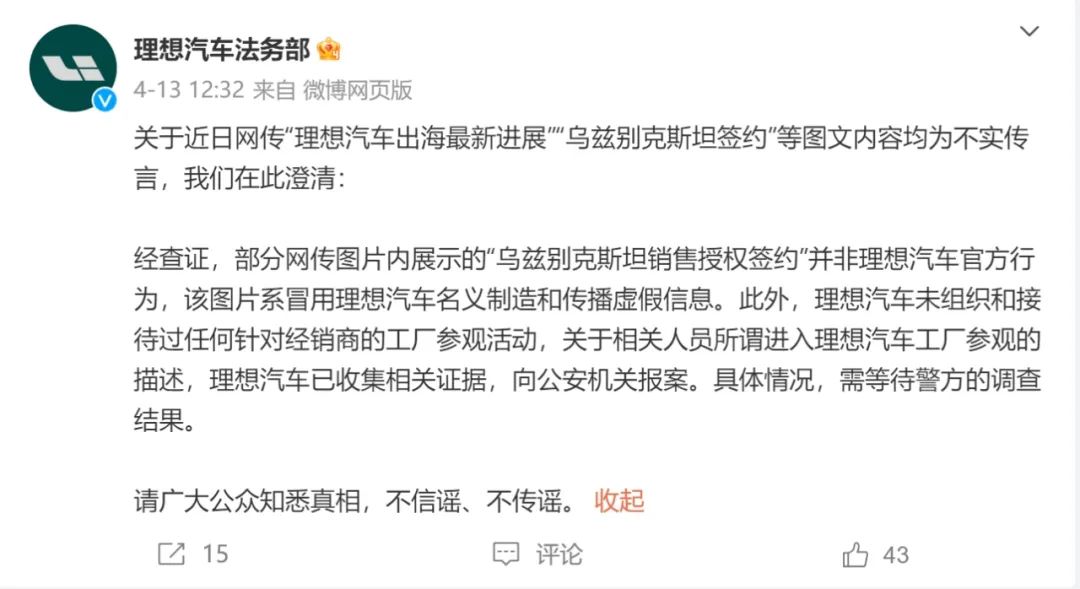 理想汽车方面表示,经查证,部分网传图片内展示的“乌兹别克斯坦销售授权签约”并非理想汽车官方行为,该图片系冒用理想汽车名义制造和传播虚假信息。此外,理想汽车未组织和接待过任何针对经销商的工厂参观活动,关于相关人员所谓进入理想汽车工厂参观的描述,理想汽车已收集相关证据,向公安机关报案,具体情况需等待警方的调查结果。