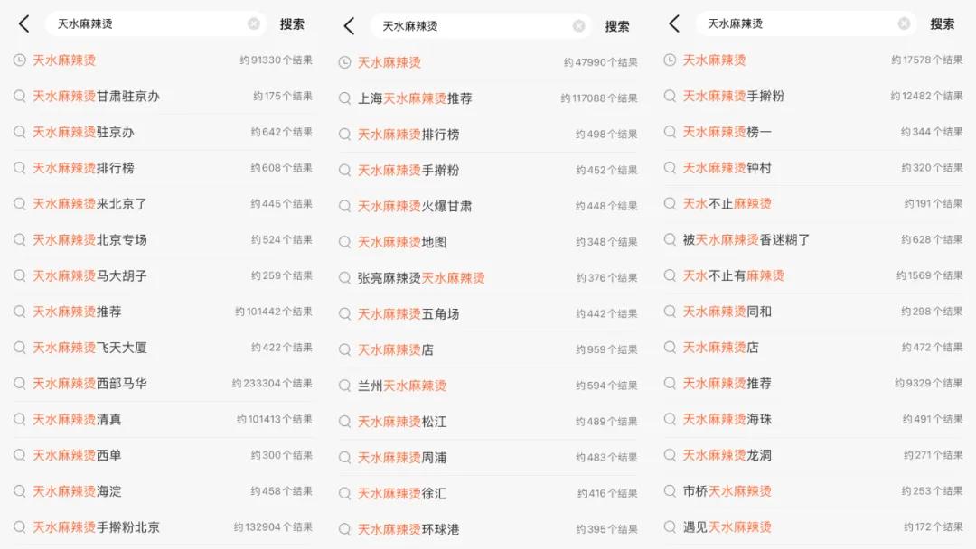 据美团、大众点评数据显示,截至3月31日,全国地区大众点评上收录的天水麻辣烫商户数近千家。在大众点评上搜索“天水麻辣烫”,与之相关的结果北京9万余条,上海4.7万余条,广州达1.7万余条。