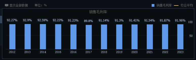直销渠道的持续扩容,贵州茅台毛利率也得以不断提升。2019年-2023年,贵州茅台毛利率由91.3%增长至91.96%,主要得益于直销渠道占比的提升。