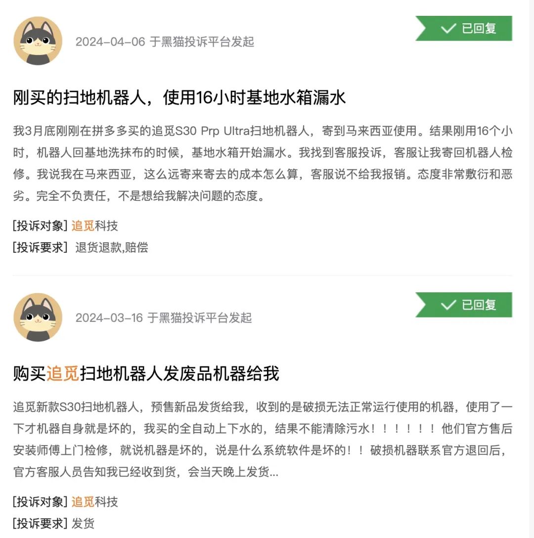 仅2024年前三个月,黑猫投诉就有超过300条有关追觅的投诉,其中还包括今年的新品S30扫地机器人,投诉原因分别是,买预售新品收到的机器无法清除污水,以及刚用16个小时后基地水箱开始漏水。
