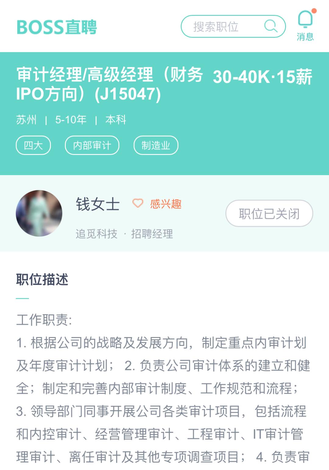 今年3月,Bloomberg报道称,智能清洁品牌追觅科技计划今年上市,随后追觅官方回应称“此为不实信息”。但网络流传的一张BOSS直聘截图页面显示,追觅科技的招聘经理曾发布过「审计经理/高级经理(财务 IPO方向)」的职位信息,该职位的状态显示为已关闭。