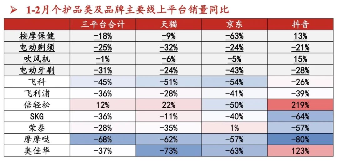 国联证券的研报显示,今年1—2月,SKG在天猫、京东、抖音的销量同比分别下滑11%、40%、64%,三平台合计销量同比下滑36%。国泰君安的研报则显示,2023年1—5月、 7—8月,各按摩品牌间销量分化明显,其中SKG承压。