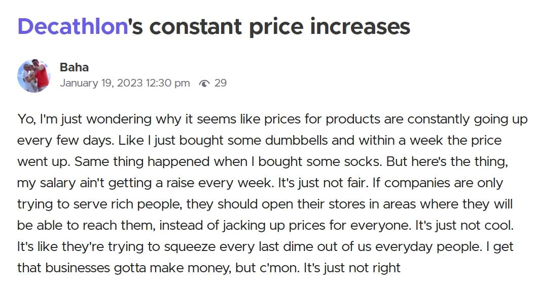 自2021年起,他们就曾在多个市场试水涨价策略。在消费投诉平台sikayetvar.com上,就曾有海外消费者发表对迪卡侬涨价的不满:
