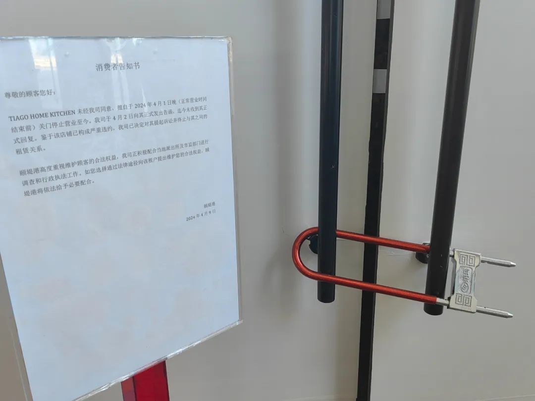4月1日晚,Tiago旗下北京颐堤港店“突发关店”,门上贴着商场方的告知书,表示门店为非正常关店,已提出诉讼。另据Tiago门店员工爆料,“两个月工资没发,也没钱给供应商结账,人家不送货,门店运行不下去了……现在我们都在走仲裁程序。”