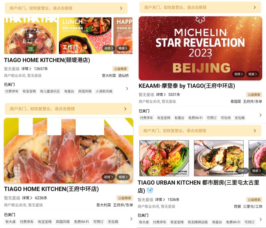 不止颐堤港门店,目前Tiago旗下在京的所有门店均已关闭。社交媒体上,不少储值未消耗的消费者维权无门,“这个品牌月初还参加了餐厅周活动,结果突然就不营业了,群也解散了,2000多的储值金额也退不了……”