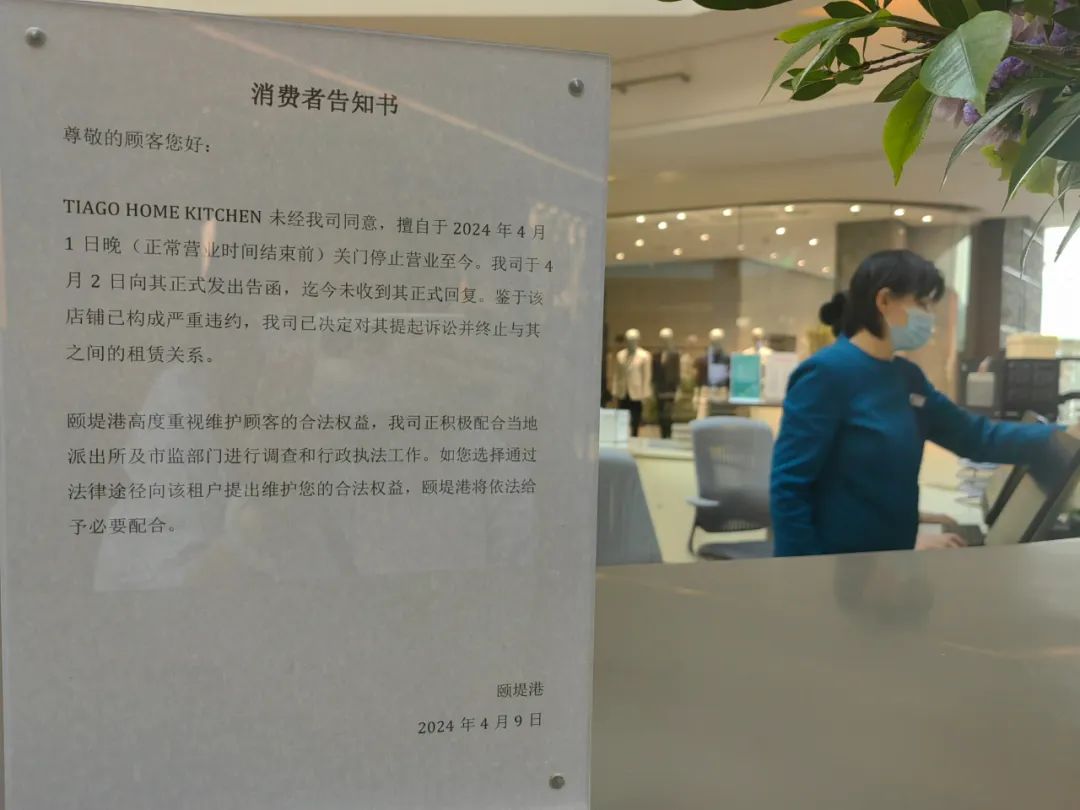 视觉上看起来,这家店似乎没有倒闭,门头干净整洁,品牌logo清晰醒目。不过,门口贴了一张以商场口吻发布的告示,表示“Tiago未经我司同意,擅自关门停业”。