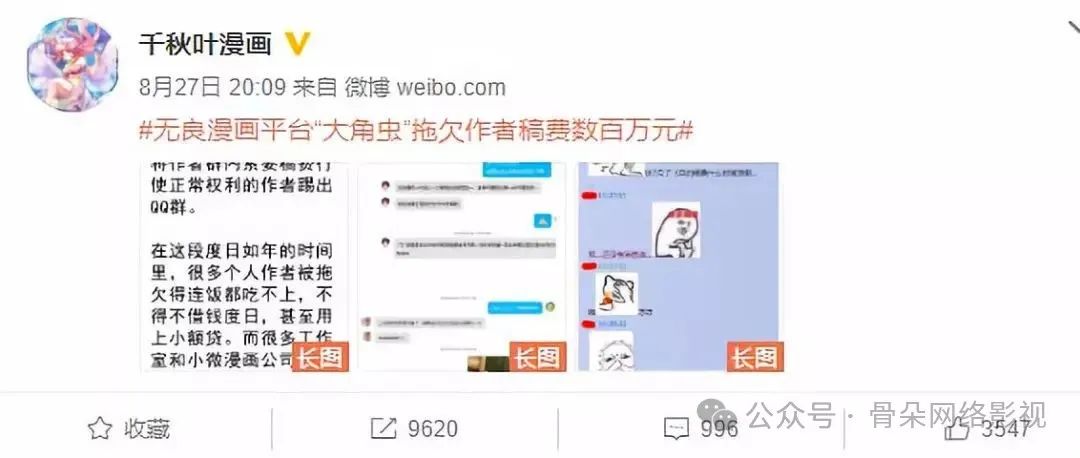 但该剧上线一个月后,漫画作者 5Choon 就在微博上控诉咪咕动漫拖欠稿费已逾六月之久。又过了一个月,微博千秋叶漫画工作室也爆料称大角虫漫画平台欠薪达四百万元。