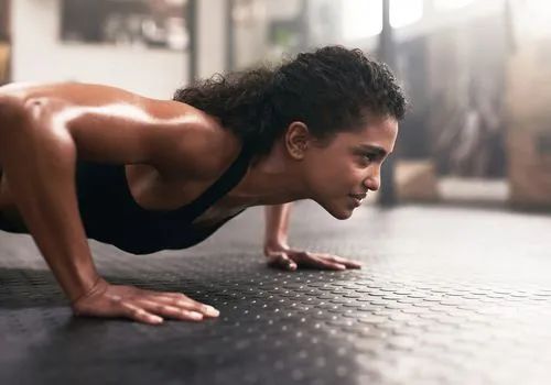 前期可以进行跪卧撑,双手分开撑在地上,双膝跪地,小腿交叉抬起,手臂发力将肩部向下压,胸部贴近地面停顿,后向上还原。当能够顺利完成25次连续跪卧撑后,尝试进行完整的俯卧撑训练。