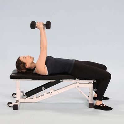 仰卧,双手握重量合适的哑铃于身体两侧,大、小臂呈90度,双手向上抬起哑铃至手肘微屈,再缓慢放下还原。