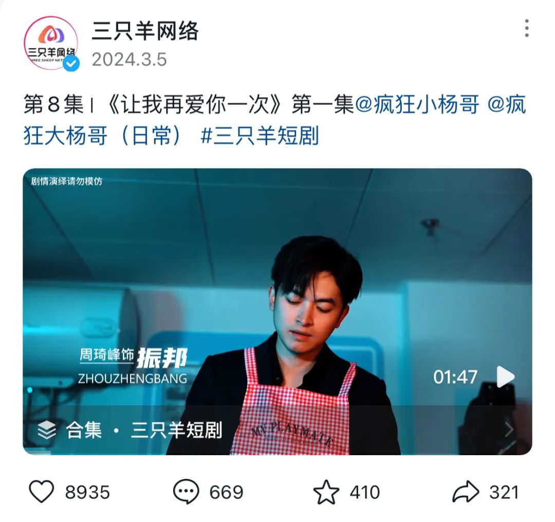 不过,三只羊的达人做短剧显然早已是内部共识,此次新剧《傅爷,你的替嫁新娘是大佬》中参演的周琦峰,正是前述两部三只羊短剧中男主角的扮演者。去年年底三只羊网络和小杨哥也曾公开称,周琦峰升任三只羊“内容生产部总导演”。
