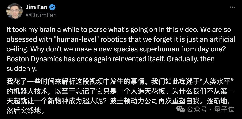 也就是说,正如Jim Fan所说,比起让人形机器人像人,现在波士顿动力更关注让机器人做到“人做不到的事”。