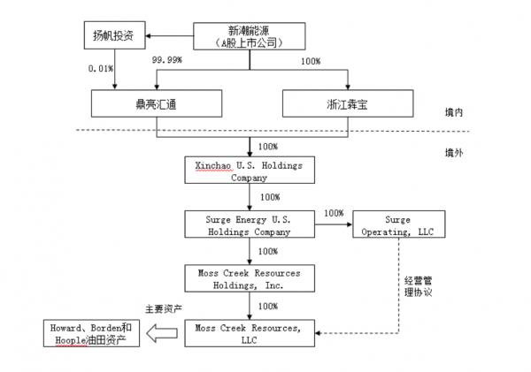 在此次架构调整完成后,境外部分,新潮美国控股公司直接持有Surge Energy 100%的股权,Surge Energy直接持有Moss Creek Resources Holdings, Inc.和Surge Operating, LLC的100%股权。