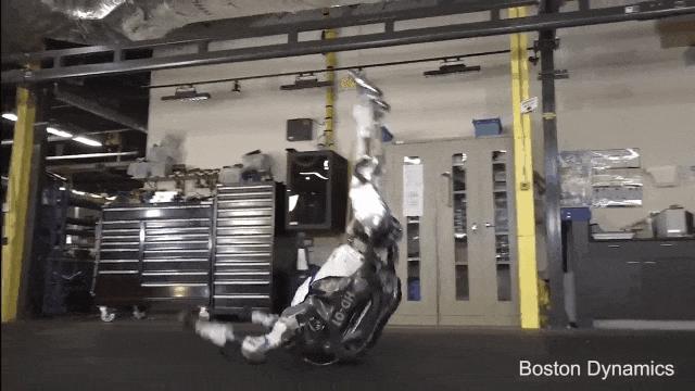 当摄像机扫过机器人时,它的腿在膝盖处弯曲。起初,这是一个自然的动作,但是后面有些出乎意料的是,Atlas 的腿在弯曲、双脚踩在地板之后,直接站立了起来,还通过腿部的巧妙旋转有效转换了位置。
