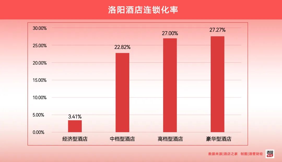 连锁化方面,截至目前,洛阳酒店的总体连锁化率仅为5.04%,低于郑州市的8.08%。其中,经济型酒店连锁化率为3.41%,中档型、高档型、豪华型的连锁化率分别为22.82%、27.00%和27.27%。该数据均低于全国平均水平。