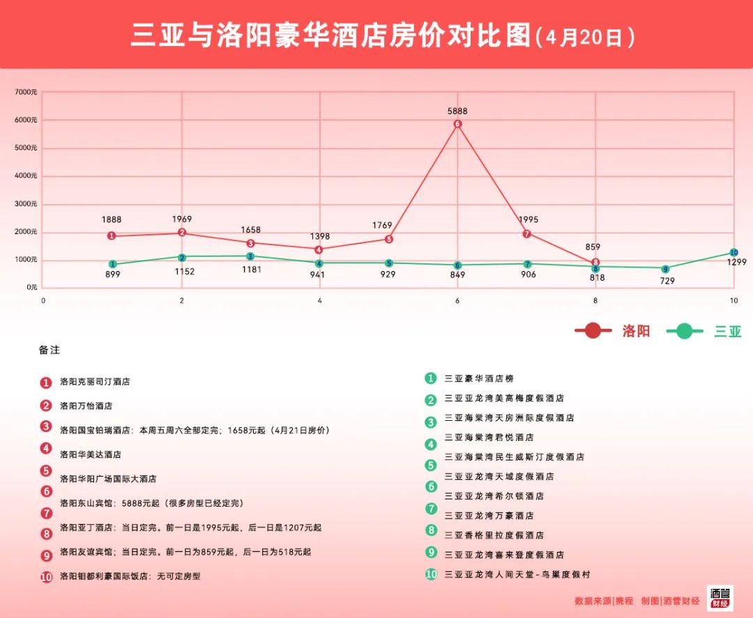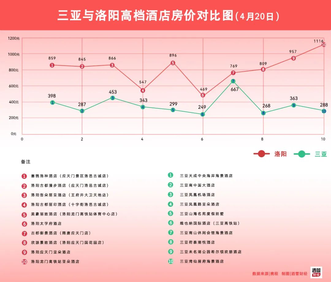 同为4月20日,三亚高档酒店榜单所包含的酒店中,酒店客房价最低为249元起,最高为667元起。而在洛阳同榜单,酒店客房价最低为469元起,最高为1116元起(部分酒店的部分房型已经定完)。