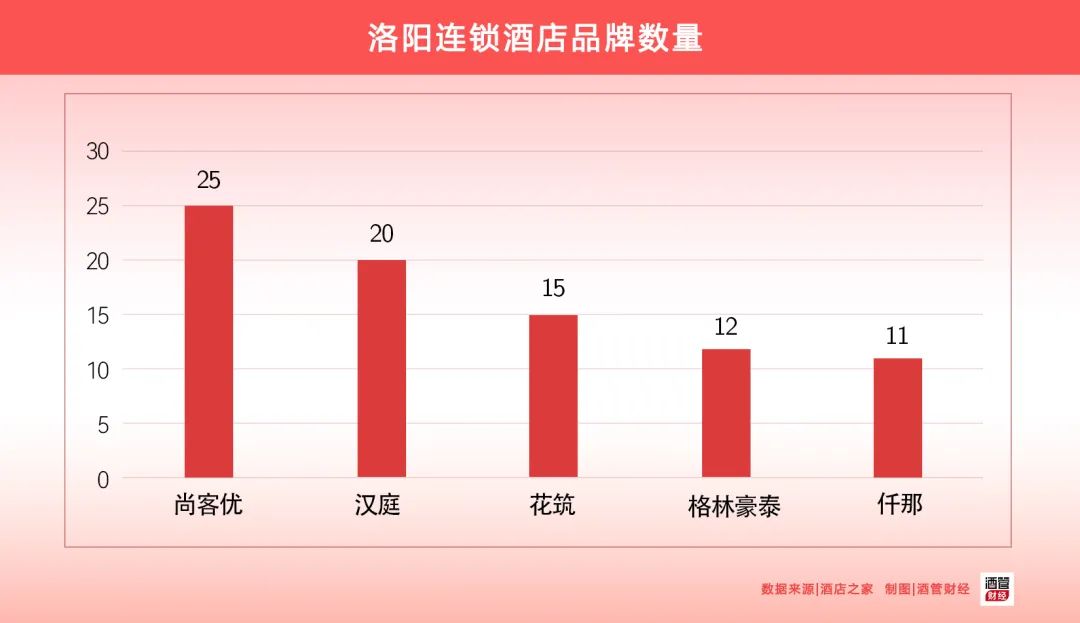 在洛阳现有的连锁酒店品牌中,尚客优位居榜首,拥有25家门店。汉庭、花筑、格林豪泰、仟那位居其后,分别拥有20家、15家、12家、11家门店。