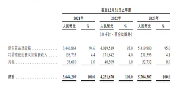 值得一提的是,近几年,茶百道加盟店占比其门店总数的99%以上。茶百道招股书显示,茶百道收入来源包括销售货品及设备,向加盟店销售乳制品、茶叶及水果等制作茶饮的材料及配料,以及包材和门店设备,特许权使用费及加盟费收入等等。其中,向加盟店销售货品及设备是茶百道的核心收入来源,2021-2023年,该收入占比茶百道总收入的94.6%-95%之间。