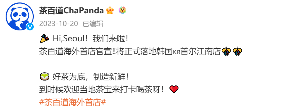 略晚于“咖灰”首店的落地,茶百道的海外首店于2024年1月在韩国首尔开业。在提升首尔店铺密度的同时,茶百道又在泰国曼谷开出东南亚首店。就在4月16日上午,茶百道澳洲账号又在社交媒体上披露,茶百道澳州首店将正式落地墨尔本唐人街。