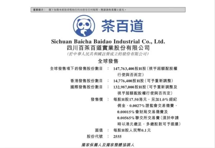 按照港交所公告内容,茶百道拟发行1.48亿股股票, 发行价为每股17.50港元,至4月18日结束,并计划将于4月23日正式以“2555”为股票代码在港交所主板挂牌上市。