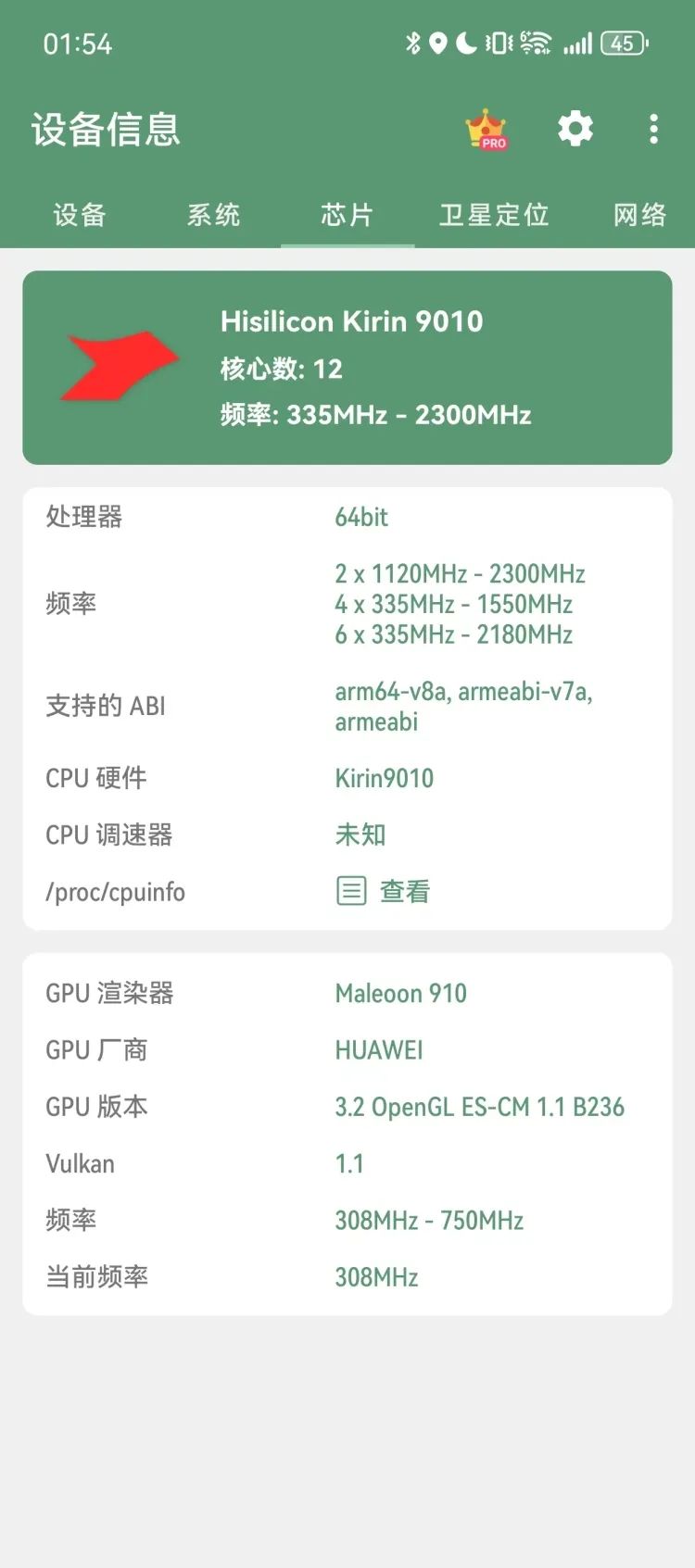 使用设备信息调用处理器信息,我惊讶地发现麒麟9010的主频对比麒麟9000s居然有一定的下降,从2.62GHz降为2.3GHz ???GPU 依旧是 Maleoon 910。