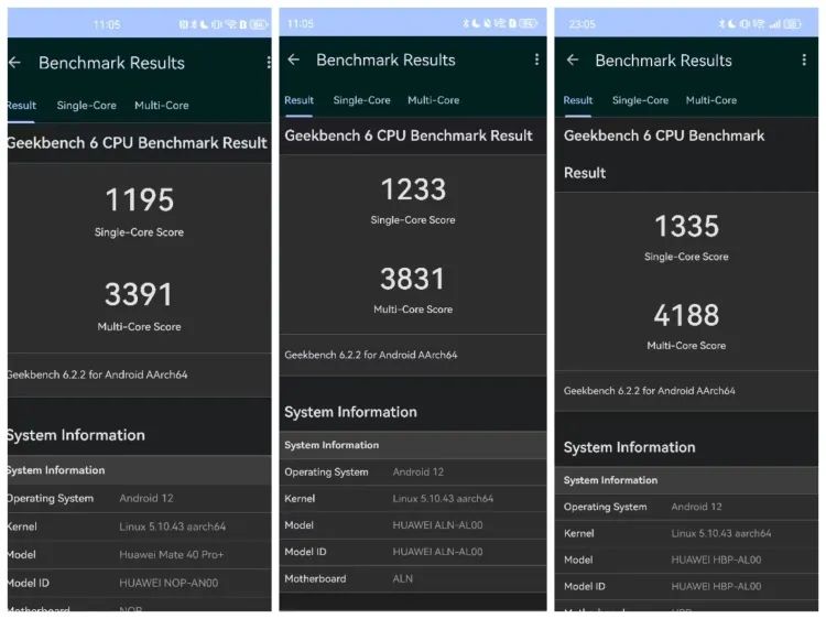GeekBench 6 从左至右分别是麒麟9000、麒麟9000S、麒麟9010 图源:LU