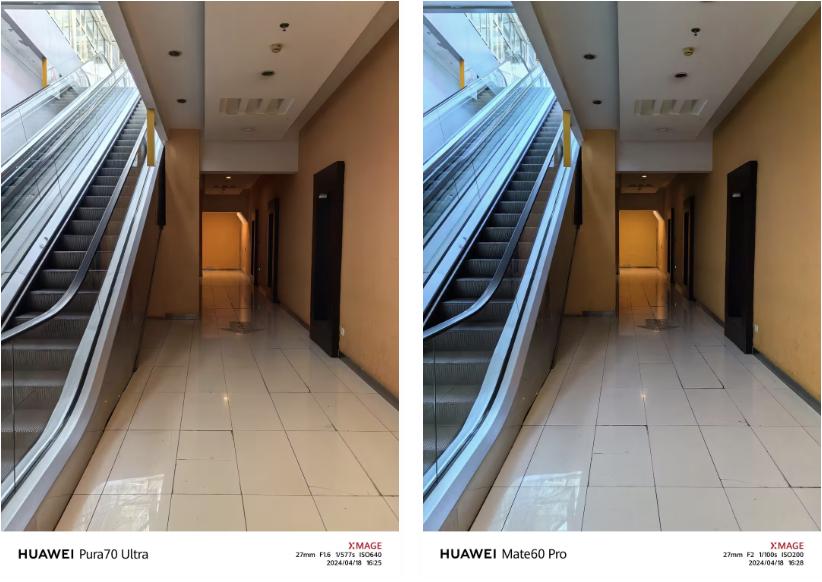 刚才下午的时候,我们找了一个比较暗的楼梯间,拿 Pura 70 Ultra 和 Mate 60 Pro 分别拍了一张照片。
