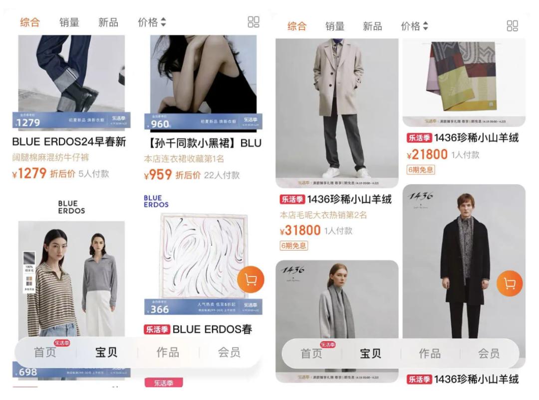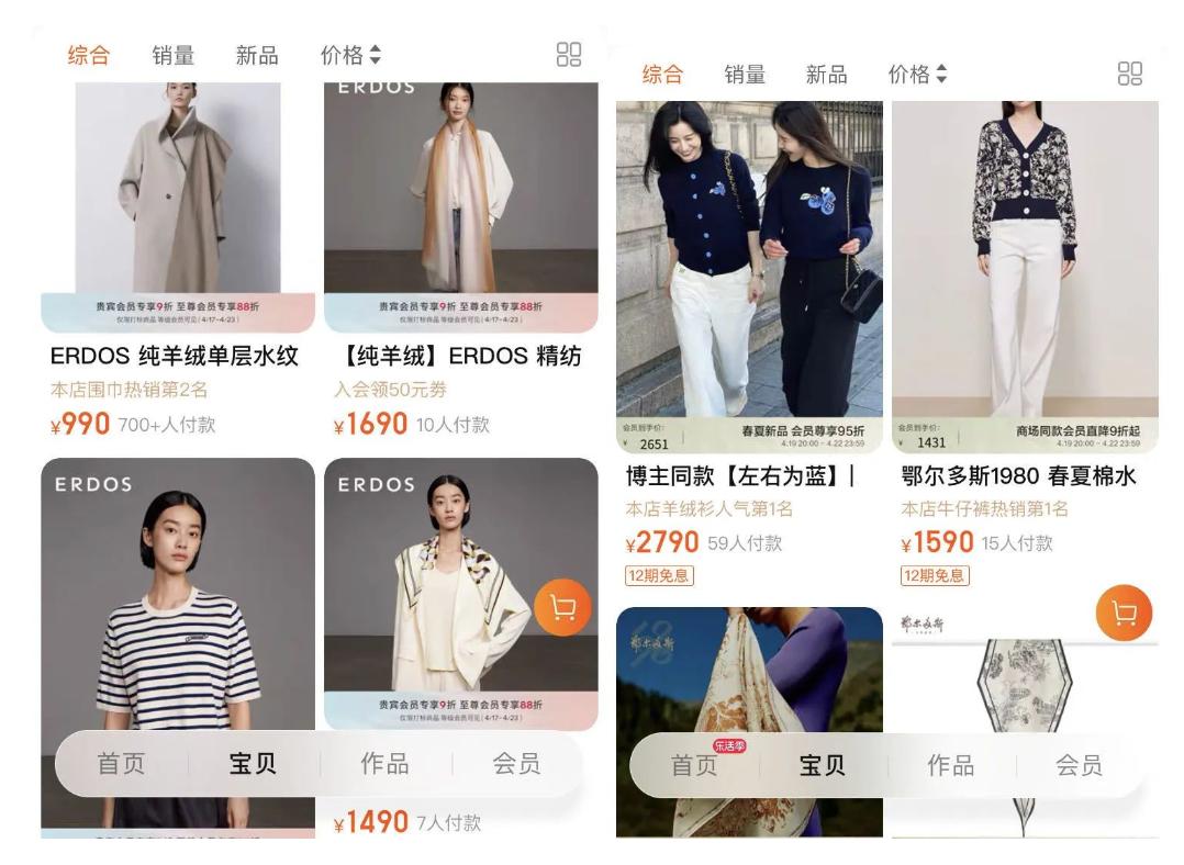 为啥1436得是“钻石级”,因为羊绒本身已经有“软黄金”之名,尤其鄂尔多斯爱用“初绒”做卖点,即采自阿尔巴斯地区小羊羔的绒毛,得薅十几只小山羊的绒毛才能织成一件羊绒衫,于是各个子品牌新品价格普遍在三四千左右,连最强调“性价比”的BLUE ERDOS,天猫店里也有大概一半衣服标价四位数。